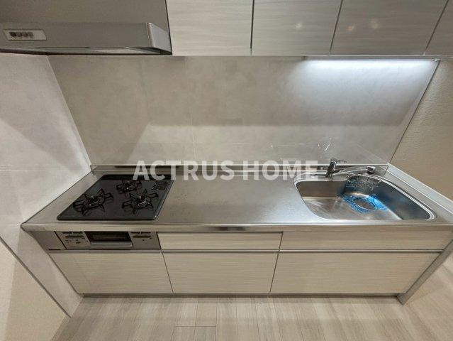 ステンレス仕上げのシステムキッチンは3口ガスコンロと大型シンクを備え、調理から片付けまでスムーズ。上部のメタリックキャビネットと下部のライトウッド収納が機能美を両立し、家事動線を最適化。手元照明付きのバックガードで作業効率UP。快適モダンキッチンとしておすすめの空間です。クリーンなステンレス天板は耐久性に優れ、日々のお手入れも簡単。バイブレーション仕上げのシンクは水はねを抑え、効率的な家事をサポート。デザイン性の高いメタリック扉とナチュラルウッドの相性が良く、インテリアを引き立てるアクセントに。他社物件との差別化を図るモダンキッチンは、暮らしの魅力を最大化します。