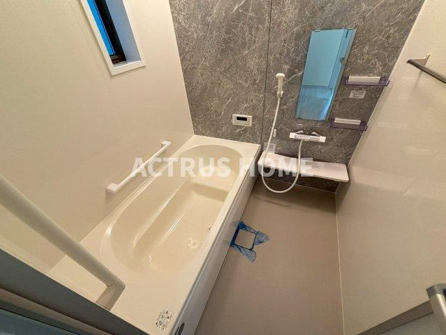 バスルームは、グレー大理石調パネルとホワイト人大浴槽が織りなす洗練の空間。手すり付き浴槽や可動式シャワーヘッド、ベンチ付きシャワーエリアで快適性を追求し、テレワーク後のリフレッシュに最適です。鏡下の2段棚&タオルバーで収納力を確保し、換気窓がカビ対策もアシスト。間接照明が柔らかな光を演出し、夜のバスタイムをムーディーに演出。大型のシャワー操作パネルは直感的に使える親切設計です。浴室乾燥機能付きで衣類やタオルの乾燥もスムーズにこなし、洗い場には段差設計を施して半身浴にも対応。ベージュ系フロアのシンプルデザインが清掃性を高める、機能性とデザイン性を兼ね備えた理想的バスルームです。