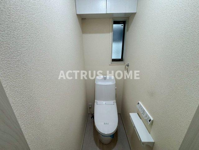 コンパクトながらもゆとりを感じる洗練トイレは、モダンデザインが光る省スペース設計が魅力。上部収納キャビネットでトイレットペーパーや掃除用品をすっきり整理OK。エコ機能付き温水洗浄便座は快適な温風乾燥&自動脱臭機能を搭載し、節水性能も◎。抗菌コートされたフロアでお手入れもスムーズ。窓から差し込む柔らかな自然光で清潔感をキープし、淡色パネルが明るさを演出。デザイン性と機能性を高次元で両立した理想的なトイレスペースが、