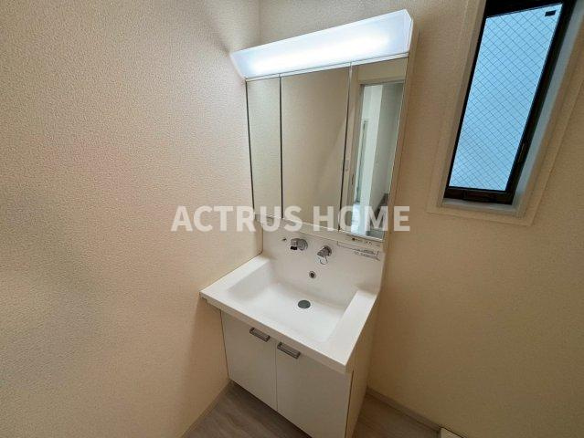ホワイトのフラットカウンターに統一されたシンプルな洗面スペースは、ミラー裏の収納付きキャビネットで日用品をすっきり収められる独立洗面台仕様。ナチュラルな壁床と窓からの自然光が心地よく、ホテルライクな上質感を演出。LED照明付きミラーで朝のヘアメイクやスキンケアも快適&省エネ設計。収納力とデザイン性を両立した理想の洗面室です。
