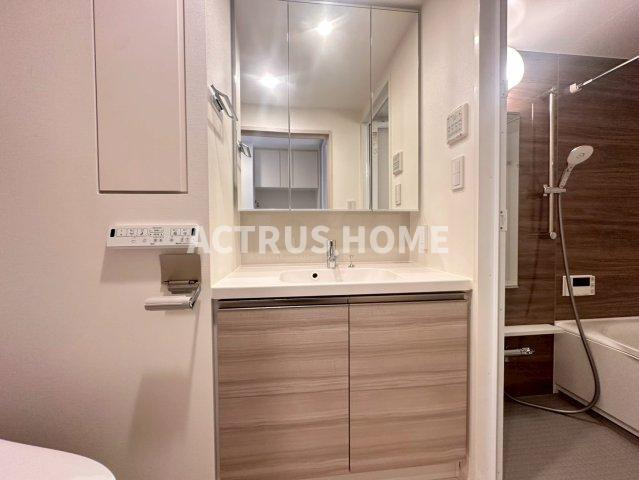 洗練された洗面スペースは、忙しい朝も気分よくスタートできる快適設計。三面鏡の裏には収納があり、化粧品や洗面用品をすっきり整理可能。木目調のキャビネットが空間に温もりを添え、清潔感のある白い洗面ボウルと調和しています。奥には浴室が見え、動線もスムーズ。阿倍野区で設備充実の1DK賃貸マンションを探している方におすすめの、機能美あふれる水回りです。賃貸物件選びで洗面台の使いやすさを重視する方は必見です。