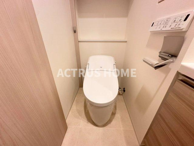 スタイリッシュで清潔感あふれるトイレ空間は、毎日の暮らしに快適さと安心感をプラス。温水洗浄機能付きの高機能トイレは、節水・衛生面でも優秀で、賃貸物件でも妥協したくない設備のひとつ。壁付けの操作パネルで使い勝手も抜群。白を基調とした内装と木目のアクセントが、落ち着いた雰囲気を演出します。阿倍野区で設備充実の1DK賃貸マンションを探している方におすすめの、細部まで配慮された水回りです。