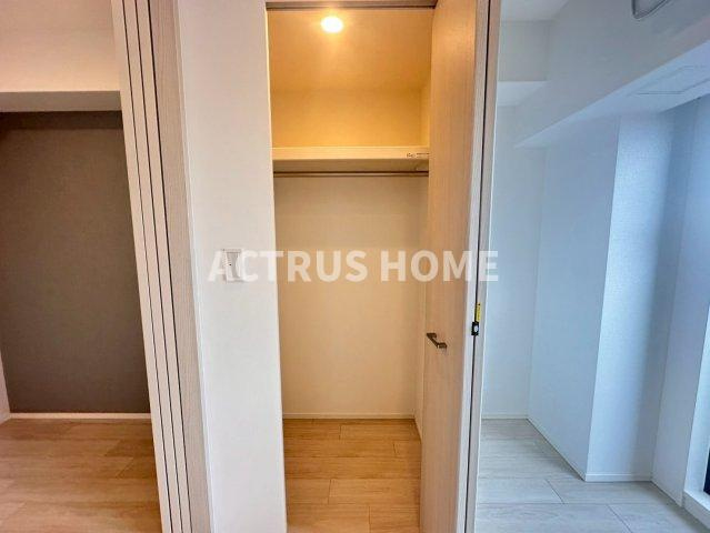 収納力と使い勝手を兼ね備えたクローゼットは、1DK賃貸マンション選びで見逃せないポイント。ハンガーパイプと上部棚で衣類から季節用品までしっかり整理でき、生活空間をすっきり保てます。木目調の扉と床が空間に統一感を与え、インテリアにも自然になじむデザイン。照明付きで視認性も高く、朝の身支度も快適。阿倍野区で設備充実の賃貸物件を探している方におすすめの、収納重視派も納得の仕様です。
