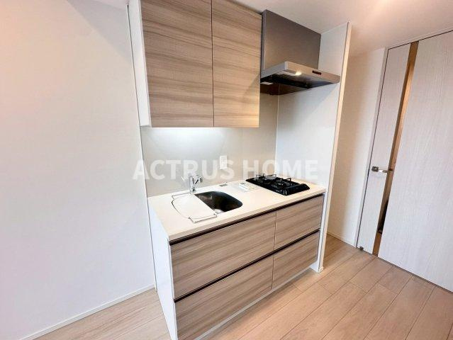コンパクトながら使い勝手抜群のシステムキッチンが魅力。2口ガスコンロに加え、収納力のある上下キャビネットで調理器具もすっきり整理可能。白×木目のナチュラルな配色が、清潔感と温もりを演出し、インテリアにもなじみやすいデザインです。一人暮らしや同棲カップルに人気の1DK賃貸で、料理好きにも嬉しい設備が揃っています。阿倍野区で設備充実の賃貸マンションを探すなら、このキッチンは見逃せません。