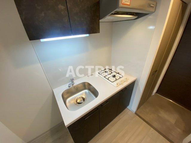 ステンレスシンク&2口ガスコンロを装備した機能的なキッチンで、毎日の自炊が快適に。継ぎ目を抑えた一体型設計で、日常の掃除も簡単。料理好きにもおすすめ! 白いカウンタートップとダークトーンの吊戸棚がモダンなコントラストを演出し、収納力も抜群。効率的なレイアウトで狭小空間を有効活用し、単身向けの賃貸物件に最適。耐水性の高いキッチンパネルは油汚れをサッと拭き取りOK。吊戸棚と足元収納が調理器具や食器をしっかり整理し、生活動線をスマートに演出します。換気扇・調理スペースも確保され、手入れのしやすい設計で作業効率◎。オートロックで防犯性も◎。コンパクトながらスタイリッシュなデザインが生活を彩ります。