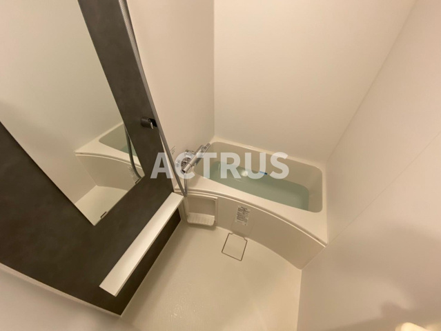 ワイドミラーとダークパネルが映えるバスルームは、清潔感あふれるホワイト基調で落ち着いた空間を演出。丸みを帯びたコーナー浴槽はゆったり浸かれる広さを確保し、毎日のバスタイムをリラックス仕様に。床は滑りにくい防滑仕様、壁面もお手入れしやすいパネル仕上げで掃除のストレスを軽減。コーナー棚や洗面台下のスペースを活かした浴室収納も完備。賃貸バスルームの快適性を追求した設備と高級感あるデザインで、ワンランク上の暮らしを演出します。
