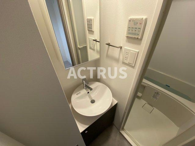 コンパクトながら機能性に優れた洗面・バスルーム。シンプルなダークキャビネットに白い丸型洗面ボウルが映え、デザイン性と実用性を両立。鏡裏収納で歯ブラシや化粧品をすっきり整理でき、掃除もラクラク。温度調節可能なシャワー付き浴槽は節水機能付きでエコにも配慮。タオルバーや浴槽横コントロールパネルが使い勝手を高め、洗い場床は滑りにくい防滑仕様。換気口とLED照明が効率よく明るさと通気性を確保し、壁面パネルは水はねをサっと拭き取れる抗菌仕様。省スペース設計ながら充実した最新設備が魅力で、賃貸バスルームの快適性を一段と引き上げます。