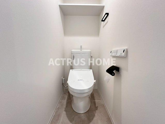 白を基調としたシンプルなトイレ空間は、余計な装飾を省いた美しい設計。壁面の操作パネルやペーパーホルダーもすっきりと収まり、機能性と静けさが共存しています。背面にはさりげない棚が設けられ、収納にも配慮されたつくり。光がやわらかく広がる照明と、清潔感のあるタイル床が、日常の一瞬を丁寧に整えてくれるような印象です。