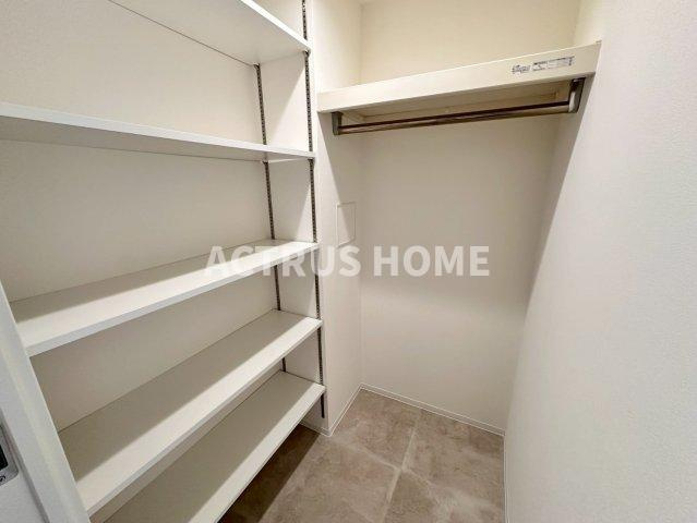 玄関から室内へと続く導線は、静かに整った美しさが漂う設計。扉の並びや照明の配置がすっきりと収まり、空間に無理のないリズムを生み出しています。奥に進むと現れるシューズウォークインは、棚とハンガーパイプがバランスよく備わり、靴やアウターをスマートに収納可能。白とグレーを基調にした内装が、清潔感と落ち着きを両立させ、日々の出入りにさりげない品を添えてくれます。