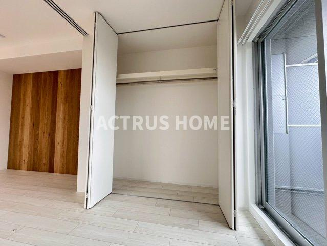 両開きの扉を開けると現れるのは、すっきりとしたクローゼット。ハンガーパイプが備えられ、衣類の収納にちょうどいいサイズ感です。余計な仕切りがないぶん、使い方の自由度も高く、空間の広がりを感じられる設計。窓から差し込む光が、収納まわりにもやわらかく届き、日常の所作が静かに整っていくような印象です。