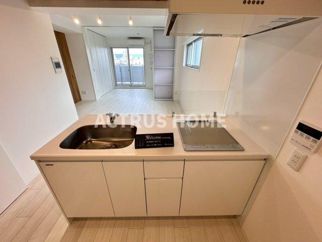 白を基調としたキッチンは、無駄のない設計と清潔感が際立つ空間。2口コンロとレンジフードがすっきりと収まり、日々の料理も心地よくこなせそうです。天井には木目のアクセントが施され、柔らかな照明が空間全体を穏やかに照らします。生活感を抑えながらも、使い勝手に配慮されたこの一角には、静かな品の良さが漂います。