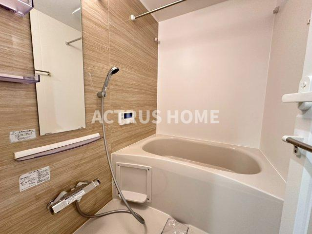 淡い木目調の壁面が、浴室にやさしい温もりを添えるデザイン。曲線が美しいバスタブと壁付けシャワーが、機能性と美しさを両立しています。鏡まわりには収納棚と照明が整えられ、使い勝手にも配慮された設計。浴室乾燥機や追い焚き機能など、日々の暮らしを支える設備も充実。静かに整った空間に、心身をほどく時間が自然と生まれそうです。