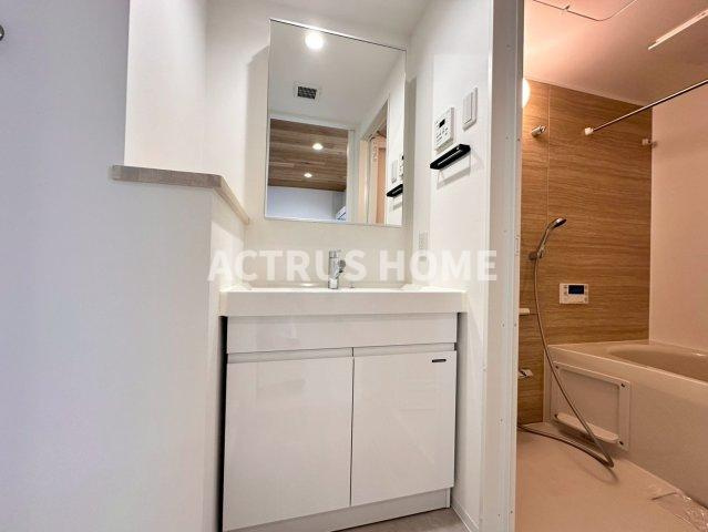 すっきりとした白の洗面台に、大きめのミラーが空間を広く見せる設計。収納力のあるキャビネットと、手元を明るく照らす照明が、朝の身支度を快適にサポートします。洗濯機置き場も隣接しており、生活動線が無理なく整うのも好印象。無駄を省いたミニマルな空間に、清潔感と使いやすさが静かに宿る洗面スペースです。