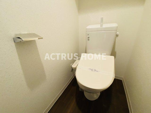 ダークウッド調の床と白い壁が織りなす、清潔感あふれるトイレ空間。温水洗浄便座付きで、毎日の使用も快適に。コンパクトながら機能的な設計で、限られたスペースを無駄なく活用しています。壁付けのペーパーホルダーやすっきりとした配管まわりが、掃除のしやすさにも配慮。賃貸マンションでトイレの使い心地や衛生面を重視する方におすすめの設備です。