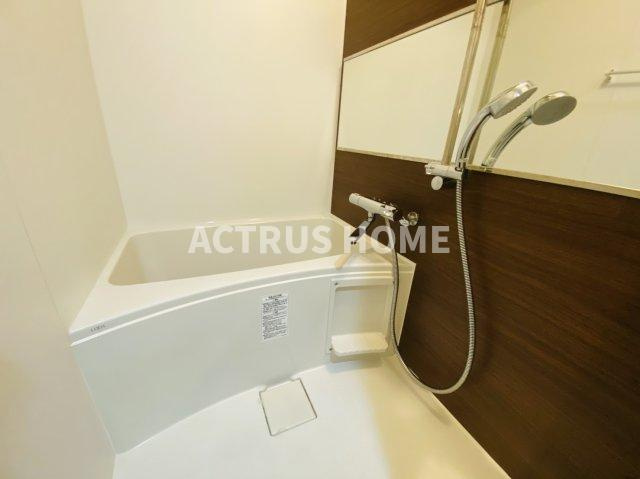 木目調パネルがアクセントになったバスルームは、落ち着きと清潔感を兼ね備えた癒しの空間。手元で操作できるシャワー付き水栓や、ゆったりとした浴槽が日々の疲れをやさしくほぐしてくれます。床には排水口があり、掃除のしやすさも◎。シンプルながら機能的な設計で、ひとり暮らしにもフィットする快適な浴室です。賃貸マンションでバストイレ別・浴室乾燥機付きの物件を探している方におすすめ。
