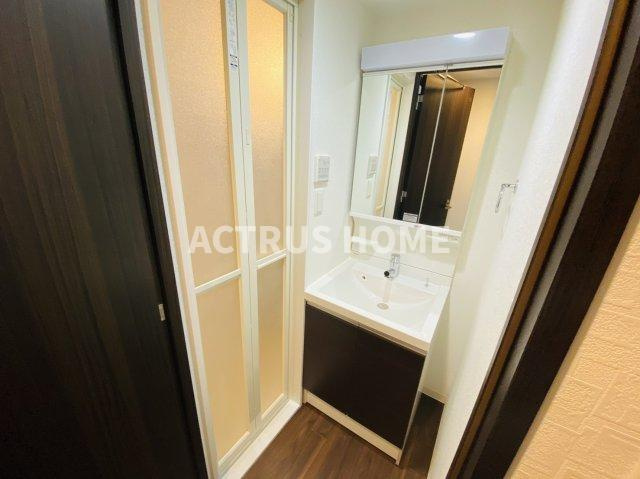 白を基調とした洗面スペースは、清潔感と機能性を兼ね備えたデザイン。鏡付きの洗面化粧台は収納力もあり、日々の身支度をスマートにサポートします。ダークブラウンのキャビネットが空間に落ち着きを与え、照明付きミラーが顔まわりを明るく照らしてくれるのも嬉しいポイント。スライドドアの奥には浴室が続き、動線もスムーズ。賃貸マンションで独立洗面台や洗面化粧台を重視する方におすすめの設備です。