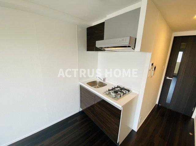 ダークウッドのキャビネットと白いカウンターが映える、スタイリッシュなキッチン空間。2口ガスコンロとレンジフードを備え、料理のしやすさと清潔感を両立。ステンレスシンクは広めで、洗い物もスムーズ。コンパクトながら収納力もあり、調理器具や食器をすっきり整理できます。ミニマルなデザインが空間に広がりを感じさせ、一人暮らしや在宅ワークにもぴったり。賃貸マンションで快適なキッチンライフを求める方におすすめです。
