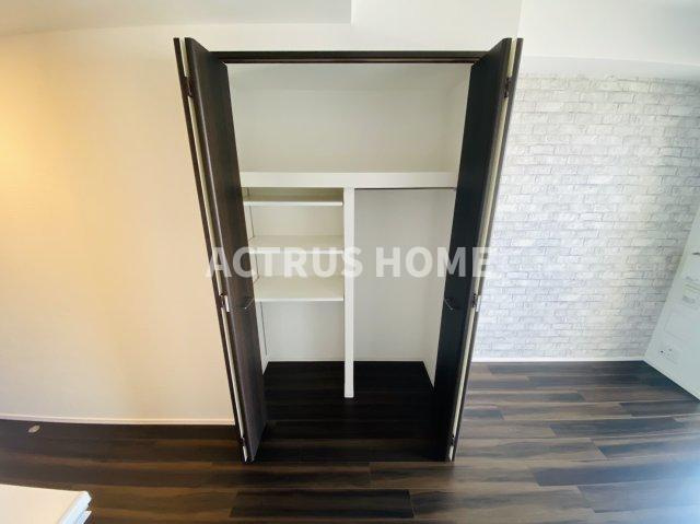 白×ダークブラウンのコントラストが美しい収納スペースは、使い勝手と見た目の両方にこだわった設計。ハンガーパイプ付きで衣類をすっきり掛けられ、棚には小物や日用品を整理整頓。扉付きで生活感を隠せるのも嬉しいポイントです。壁面に馴染むスマートな配置で、空間を広く見せながら収納力も確保。賃貸マンションでクローゼット収納やシューズボックスを重視する方におすすめの設備です。