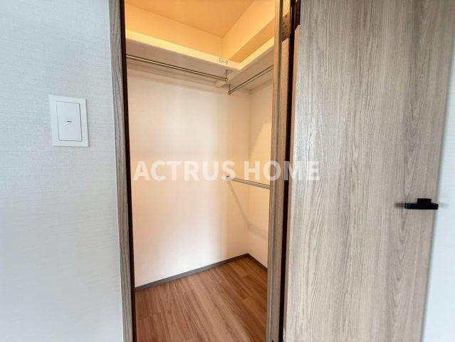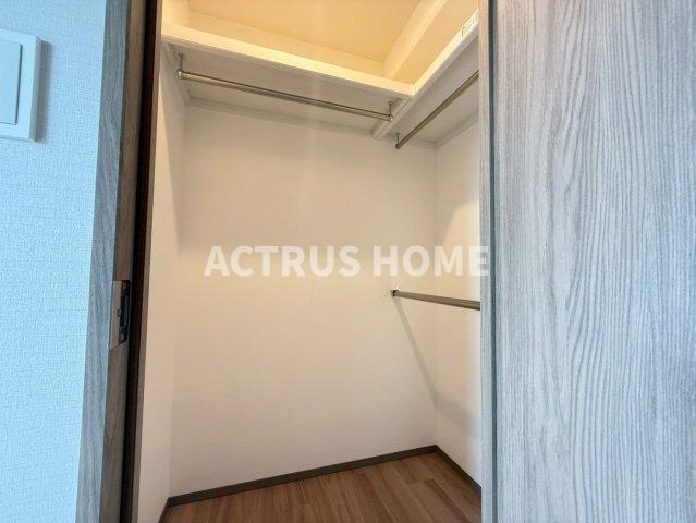 木目床と白壁の清潔感ある空間に、上下2段のハンガーパイプと上部棚が整然と配され、服から小物まで美しく収納できます。動線が短く着替えがスムーズで季節ごとの洋服管理も容易。見せる収納でクローゼット自体がインテリアになり、賃貸でも収納力と上質感を両立した一室です。