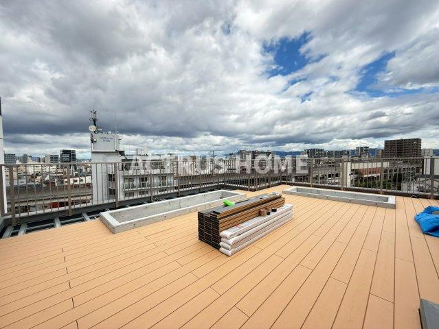 木目のウッドデッキとプランター、クッションシーティングが揃った屋外空間は、都会の眺望を独占するプライベートリビングの延長線上にあります。開放感ある視界とドラマチックな空の演出で朝のコーヒーから夕暮れのホームパーティーまで使えるのが魅力。ガーデニングやチェアを置いたくつろぎのゾーンとして実用的で、屋外でのリフレッシュやゲストを招く演出に最適なルーフバルコニーです。