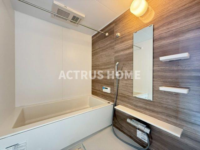 木目パネルが温かみを与えるバスルームは、角の取れた浴槽と壁付シャワーの組み合わせでリラックス性が高い。縦長ミラーと浮き棚で使い勝手が良く、操作パネルでお湯の温度調節が直感的に行える清潔感ある設計。浴室の照明と換気設備が整い、日々の入浴がホテルライクな時間になる点はバスルーム重視の方に刺さるアピールポイントです。