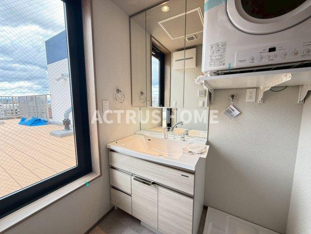 コンパクト設計ながら導線に配慮された洗面スペース。木目キャビネットと大きな鏡が視覚的な広がりを生み、カウンター一体型の洗面ボウルは掃除しやすく清潔感が続く。洗濯機が上段に収まる省スペース配置で空間を有効活用。窓からの採光で朝の身支度も快適に行え、電源やタオルリングの配置など生活動線の細かい配慮が見える点も魅力。機能性と見た目を両立した使い勝手の良いパウダールームです。