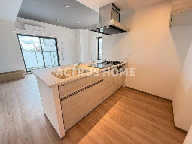 明るい木目の収納と白い一体型カウンターは視覚的な格を上げ、ビルトインのガスコンロとステンレスレンジフードはプロ仕様の雰囲気を醸す。シンク横のコンパクト食器洗乾燥機で時間を生み、窓からの採光が料理を愉しむ空間に昇華する。リビングとつながる設計はホームパーティーや在宅ワークでの振る舞いを自然に格上げする、一室の顔になるキッチンです。