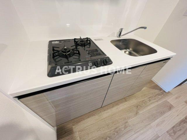 2口ガスコンロとステンレスシンクが横並びで、調理から片付けまでの動線がスムーズ。