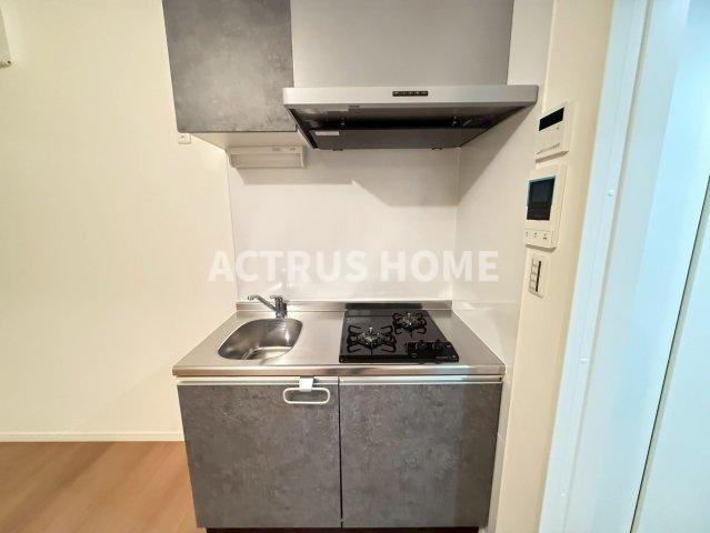 コンパクトながら使い勝手の良いシステムキッチンが魅力。2口ガスコンロにレンジフード、上下収納付きで調理も片付けもスムーズ。ステンレスシンクの清潔感と、白壁×木目フロアの組み合わせが空間を明るく見せてくれます。一人暮らしやカップルの賃貸生活にぴったりな、機能性とデザイン性を兼ね備えたキッチンです。大阪で設備充実の賃貸物件を探している方は要チェック。