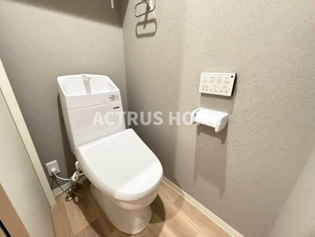 温水洗浄便座付きの高機能トイレは、毎日の暮らしに快適さをプラス。タンク上部の手洗いスペースは省スペース設計ながら実用的で、水回りの動線もスムーズです。壁付けの操作パネルで、便座の温度調整や洗浄機能も簡単に操作可能。グレーの壁と木目調フロアが落ち着いた雰囲気を演出し、清潔感とデザイン性を両立した空間です。大阪で設備充実の賃貸物件を探す方におすすめのポイントです。