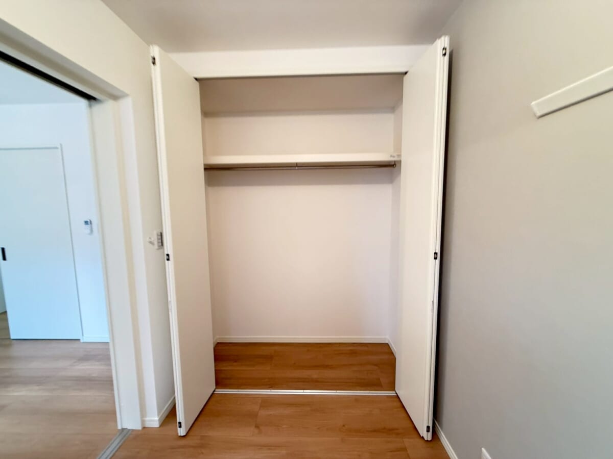 収納力に優れた賃貸物件を探している方におすすめ。キッチン横には5段の棚収納があり、食品ストックや日用品の整理にぴったり。奥行きもあるので、見た目以上にしっかり入ります。さらに、洋服を掛けられるハンガーパイプ付きクローゼットも完備。生活動線に沿った配置で、使いやすさと機能性を両立。大阪で収納充実の1LDKを探すなら、ぜひチェックしたいポイントです。