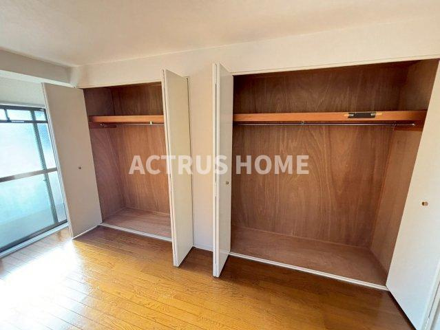 木目調のクローゼットが並ぶ室内は、収納力と開放感を兼ね備えた魅力的な空間。ハンガーパイプ付きで衣類の整理がしやすく、扉を開けたままでも圧迫感がない設計が嬉しいポイント。窓から差し込む自然光がフローリングを優しく照らし、明るく清潔感のある印象を与えます。賃貸マンションで「収納充実」「自然光」「使いやすい間取り」を重視する方におすすめの一室です。