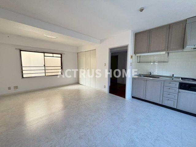 白を基調とした明るい室内は、清潔感と開放感が際立つ空間。南向きの大きな窓から自然光がたっぷり差し込み、日中は照明いらずの快適なリビングに。キッチンは収納力のあるグレーのキャビネットと、使いやすいステンレスシンクを備え、料理好きにも嬉しい設計。隣接する洋室との動線もスムーズで、生活のしやすさが魅力です。賃貸マンションで「日当たり」「収納」「動線設計」を重視する方におすすめの一室です。