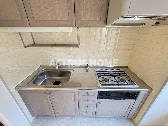 木目調のキッチンが温かみを演出する、コンパクトながら機能的な空間。ステンレス製のシンクと2口ガスコンロが一体化されたカウンターは、掃除がしやすく使い勝手も抜群。上下に設けられた収納スペースと吊り棚で、調理器具や食材の整理もスムーズです。賃貸マンションで「コンパクトキッチン」「収納力」「使いやすさ」を重視する方にぴったり。毎日の料理が楽しくなる、暮らしに寄り添うキッチンです。