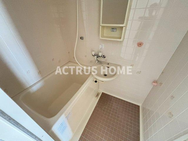 浴室はコンパクトながら、使いやすさと清潔感を兼ね備えた設計。白を基調としたタイル壁が空間を明るく見せ、ブラウンの床タイルが落ち着いた印象をプラス。浴槽・洗面・シャワーが一体となったユニットバスは、水回りの動線が効率的で、忙しい朝にも便利です。鏡付き収納で洗面まわりもすっきり整い、賃貸マンションで「水回りの快適さ」「清潔感」「省スペース設計」を重視する方におすすめのバスルームです。