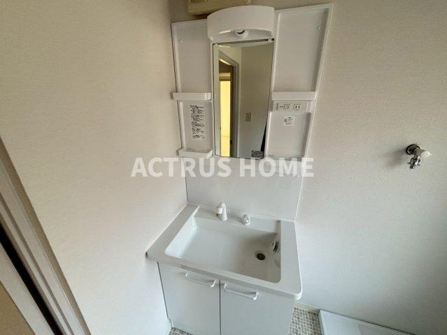 洗面台は白を基調としたシンプルなデザインで、清潔感と機能性を両立。鏡の両側に縦型収納が備えられており、化粧品や洗面用品をすっきり整理できます。下部のキャビネットも収納力があり、生活感を隠しながら空間を美しく保てるのが魅力。照明付きのミラーは朝の身支度にも便利で、賃貸マンションで「洗面台収納」「清潔感」「使いやすさ」を重視する方におすすめです。