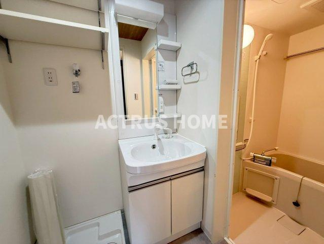 洗面台・洗濯機置き場・浴室がひとつにまとまった水回りは、限られた空間を最大限に活かす設計。鏡付き洗面台には収納棚もあり、日々の身支度がスムーズに。洗濯機置き場の上部には棚が設けられ、洗剤やタオル類の整理にも便利です。浴室は深めのバスタブとシャワー付きで、リラックスできる時間をしっかり確保。「独立洗面台」「室内洗濯機置き場」「バストイレ別」など、賃貸マンション探しで人気の設備が揃った快適な水回りです。
