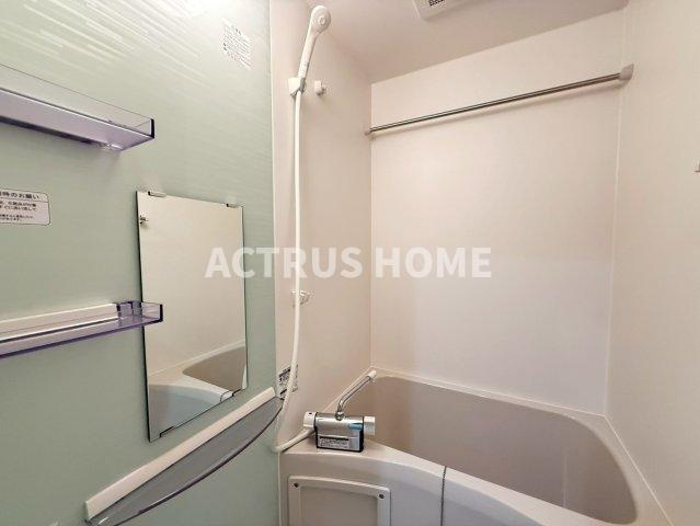 浴室には、手入れのしやすいユニットバスを採用。壁面の淡いグリーンが空間にやさしい印象を与え、鏡横の収納棚は日用品の整理に便利です。シャワーカーテン用のポールも設置済みで、水はね対策も万全。賃貸マンションで人気の「浴室乾燥機」「バストイレ別」「清潔感ある水回り」といった検索キーワードにマッチする仕様で、都市型の一人暮らしやカップルの暮らしにフィットする快適なバスルームです。