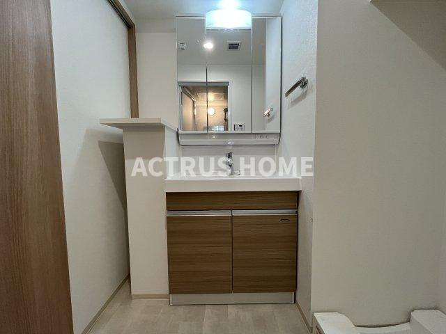 木目の質感と白の清潔感が調和した洗面台は、毎朝のルーティンを整えてくれる頼れる存在です。三面鏡の裏にはしっかり収納があり、生活感を隠しながら必要なものをすぐ手に取れる快適さを実現。カウンターは無駄のないフラット設計で、手入れがしやすく常に清潔を保ちやすい点も魅力です。壁付けのタオルバーや照明付きミラーなど、使い勝手を高める細やかな配慮が随所に感じられます。水回りの快適さを重視する方に、自信を持っておすすめできる洗面空間です。