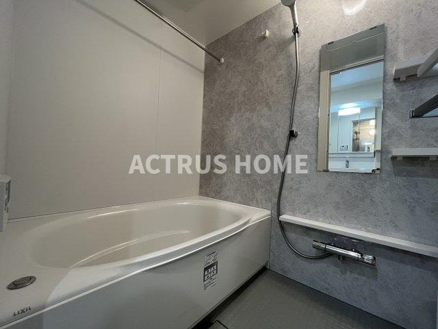 グレーのアクセントパネルが映える浴室は、賃貸とは思えないほどの上質感。壁付けシャワーとミラー、収納棚がコンパクトにまとまり、使いやすさと清掃性を両立。浴槽はゆるやかなカーブでリラックスしやすく、毎日の疲れをしっかり癒せる設計です。浴室乾燥機や追い焚き機能といった人気設備とも相性抜群。水回りの快適さを重視する方におすすめの、設備充実の賃貸バスルームです。