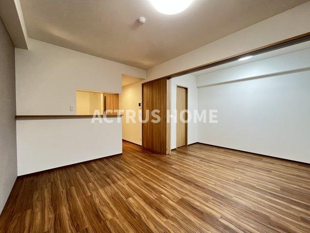 木目フローリングが映える落ち着いたリビングは、家具のレイアウトがしやすく、自分らしい空間づくりを楽しめるのが魅力。白を基調とした壁が光を柔らかく広げ、どの時間帯も心地よく過ごせる明るさをキープしてくれます。キッチンとつながる小窓は、調理中でも部屋の気配を感じられる便利な設計。スライド扉の先に続くスペースは、用途に合わせて柔軟に使えるのもポイント。賃貸で快適な暮らしを求める方に、住み心地の良さがしっかり伝わる一枚です。
