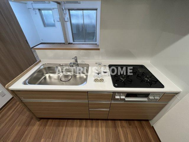 白×木目のコントラストが美しいシステムキッチンは、賃貸とは思えないほどの完成度。2口ガスコンロと広めのシンクが並び、料理のしやすさも抜群。下部収納は横目の木調仕上げで、空間に温かみを添えながら生活感をスマートに隠せます。背面には窓とスライドドアがあり、採光と通気性も良好。キッチンからリビング全体を見渡せる設計で、ひとり時間も誰かとの時間も心地よく過ごせる賃貸物件です。