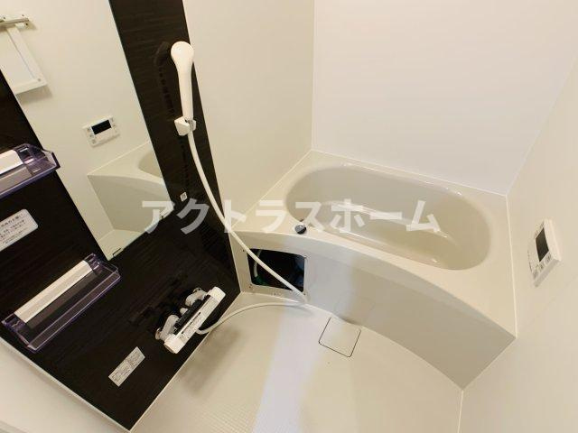 浴室乾燥機・追い焚き機能付きのバスルームは、快適さと機能性を両立した空間。ダークトーンのパネルに鏡と収納棚が配置され、スタイリッシュな印象を与えつつ、使い勝手も抜群です。水温調整ができるパネルも設置されており、毎日のバスタイムがより快適に。「阿倍野 賃貸 追い焚き」「浴室乾燥機付き 1K」などで検索する方にとって、暮らしの質を高めるポイントが詰まった一室です。