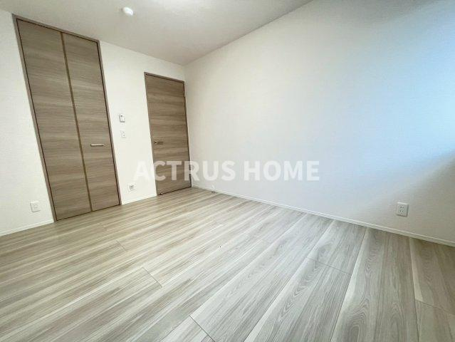 明るい木目フロアと白い壁が、部屋全体にやわらかな清潔感をもたらす一枚です。二枚の木目扉が並ぶことで、収納と動線がすっきり整理され、生活のしやすさが自然と伝わります。扉の色味と床材の相性も良く、落ち着いた統一感が感じられる点が魅力。右側から差し込む光が空間をやさしく照らし、シンプルな室内に心地よい明るさを添えています。賃貸マンションの洋室として、暮らしのイメージが丁寧に思い描ける写真です。