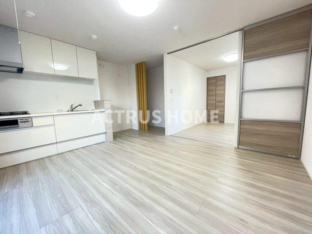 やわらかな木目フロアと白を基調としたキッチンが、空間に落ち着いた明るさをもたらす一枚。生活動線を意識したスライドドアは、リビングと洋室を自然につなぎ、賃貸マンションで求められる使いやすさを丁寧に感じさせてくれる。キッチン横の収納スペースは日用品をすっきり収められ、暮らしの整えやすさが伝わるポイント。天井照明の柔らかな光が部屋全体に広がり、毎日の時間を穏やかに包み込むような雰囲気が印象的なリビングです。