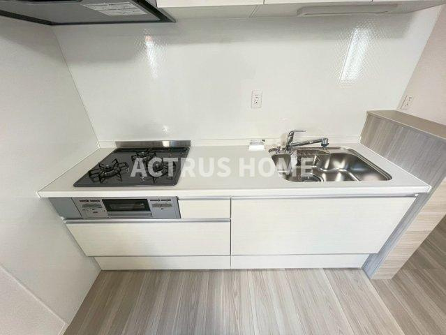 白を基調としたキッチンは、清潔感と扱いやすさがしっかり伝わるつくりです。二口コンロとシンクが横並びに配置され、調理から片付けまでの流れが自然に整う点が魅力。下部収納はフラットなデザインで、空間にすっきりとした統一感を生み出しています。明るい木目フロアとの相性も良く、毎日の料理時間が心地よく感じられる印象。賃貸マンションのキッチンとして、機能性と見た目のバランスが丁寧に整った一枚です。