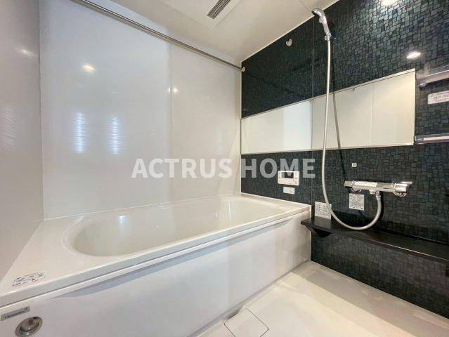 落ち着いた色味のタイルと白い浴槽のコントラストが美しく、空間全体に上質な雰囲気が漂うバスルームです。壁面に設けられたワイドミラーは視界を広げ、限られたスペースでもゆとりを感じられるつくり。シャワーヘッドや水栓まわりもすっきりと配置され、日々の入浴時間を快適に整えてくれます。棚が備わっていることで、シャンプー類を手の届く位置に置ける点も魅力。賃貸マンションの設備として、デザイン性と使いやすさのバランスが丁寧に整った印象の一枚です。